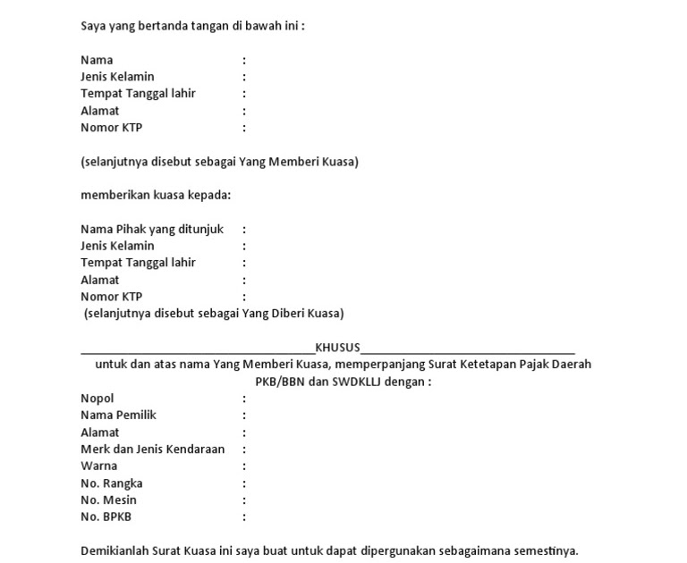 Surat yang menjadi bukti kepemilikan kendaraan bermotor seperti bpkb merupakan benda yang cukup penting. Setiap anda melakukan pembelian kendaraan bermotor nantinya anda akan mendapatkan surat bpkb. Contoh surat penarikan kendaraan yang resmi sebagai referensi yang baik untuk mengetahui bentuk dari surat penarikan kendaraan. Oleh karenanya bila kamu hendak. Cara dan syaratnya tetap sama namun ada tambahan dokumen lain yaitu surat kuasa yang menyatakan bahwa pengambilan bpkb di wakilkan orang lain. Pos rt 003/001 bojonggede memberikan kuasa kepada : Dengan menggunakan surat kuasa ini maka tidak akan ada keraguan terhadap si penerima kuasa karena telah memiliki bukti perintah resmi. Simak contoh surat kuasa pengambilan bpkb di sini! Tinggal tunjukkan saja ke petugasnya lalu tunggu sampai plat nomor barunya jadi. Dengan ini pemberi kuasa memberikan kuasa, berupa : 0 down votes mark as not useful. Contoh surat kuasa pengambilan bkpb mobil di leasing. Karenanya ia bisa memberi pelimpahan wewenang pada orang lain.