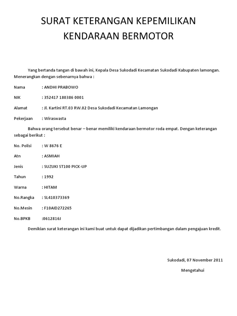 Surat keterangan kepemilikan kendaraan by dewisyarvian in types > legal forms and surat keterangan kepemilikan.