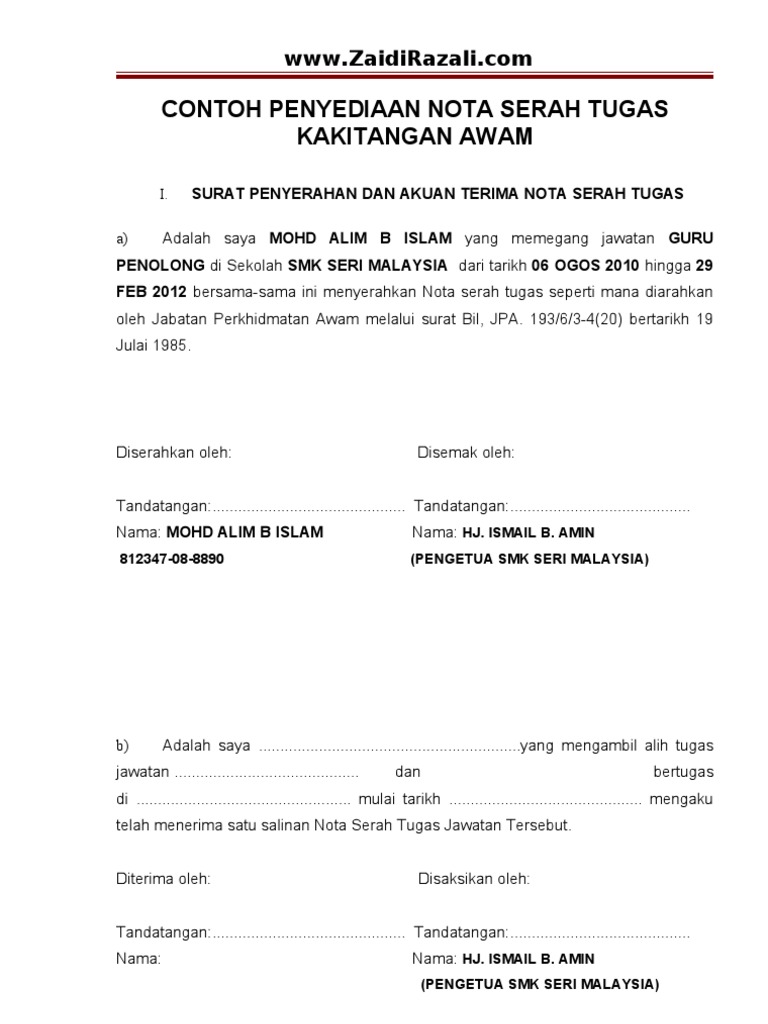 Nota Serah Tugas Doc Document from static.fdokumen.com Surat serahan tugas 19 contoh surat kuasa pengalihan jabatan sementara berikut ini. Surat penyerahan dan akuan terima nota serah tugas 2. Disertakan juga bersamasama ini fail meja / manual prosedur kerja*. Surat an serahan tugas emi. Borang nota penyerahan tugas pegawai yang bertukar 3. Semoga perkongsian cikgu ini allah terima sebagai ibadah dan diganjari pahala. Surat peyerahan dan akuan terima i. Borang nota penyerahan tugas pegawai yang bertukar 3.