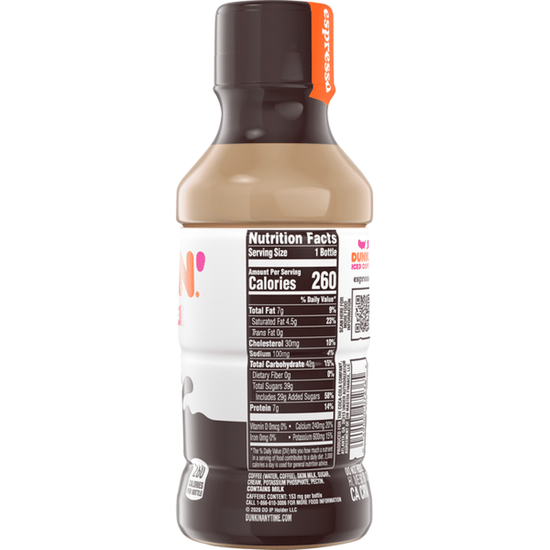 There are 260 calories in 1 bottle (13.7 oz) of dunkin' donuts iced coffee espresso. Rich, smooth coffee and milk beverage. Dunkin' donuts espresso iced coffee bottle. A little less than two years ago, dunkin' donuts launched its first bottled iced coffee drinks. America's iced coffee made to keep you going and make the best of your day.